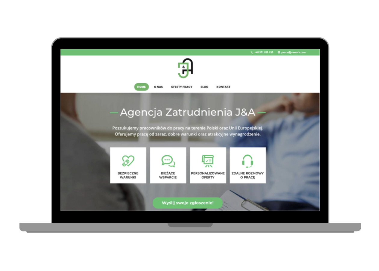 W pierwszej kolejności najważniejszym dla nas działaniem było stworzenie dwujęzycznej strony internetowej, której głównym celem jest przedstawienie ofert pracy oraz działalności firmy J&A Work.